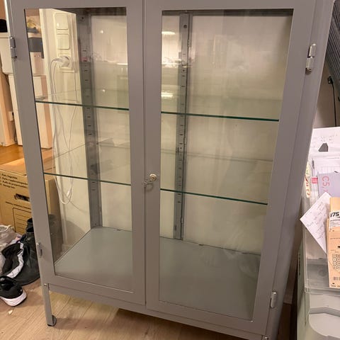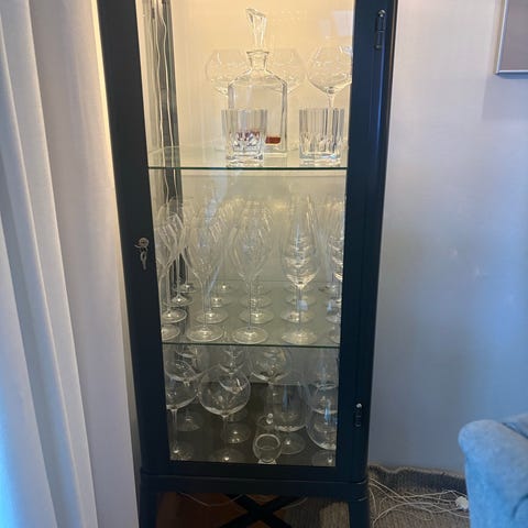 Säljer vårt svarta vitrinskåp i glas/metall.