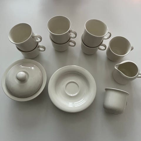 4 koppar med fat och assietter + en mjölkkanna.