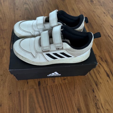 Adidas barnskor sneakers i storlek 31 för unisex. Skorna är vita med kardborreband för enkel av- och påtagning. Ovandel i syntetmaterial med perforeringar på sidorna. Yttersula i gummi med mönster för grepp. Passar som vardagsskor eller till lättare aktivitet för barn.