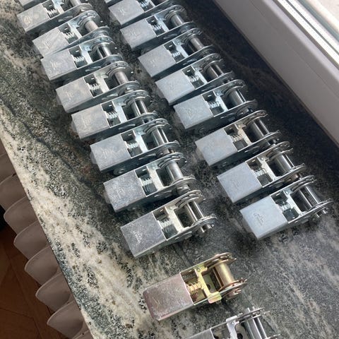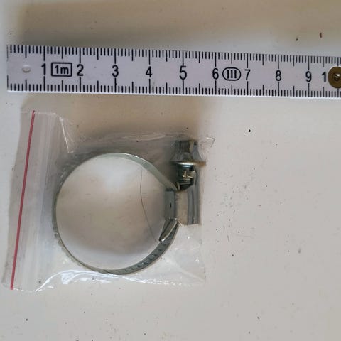 Förpackning med skruvar och plastplugg. Lämpliga för enklare montering i vägg eller annat underlag där plugg behövs. En måttstock syns på bilden som referens för storlek på skruvar och plugg.