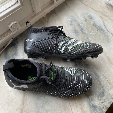 Puma fotbollsskor med dobbar för spel på natur- eller konstgräs. Skorna är svarta med vita detaljer och har snörning framtill. Överdelen är i syntetmaterial med strukturerad yta för bättre bollkontroll. Yttersulan har fasta plastdobbar placerade för grepp och stabilitet vid riktningsförändringar. Invändigt finns textilfoder för komfort runt foten. Lämpliga som fotbollsskor för träning och matchspel.