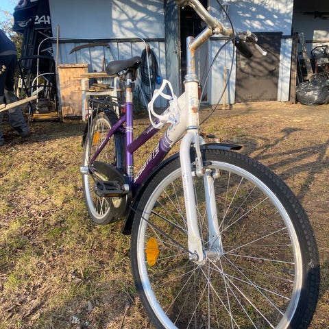 Yosemite barncykel med 24" hjul. Cykeln har ram i lila och vitt med mönster på ramen.