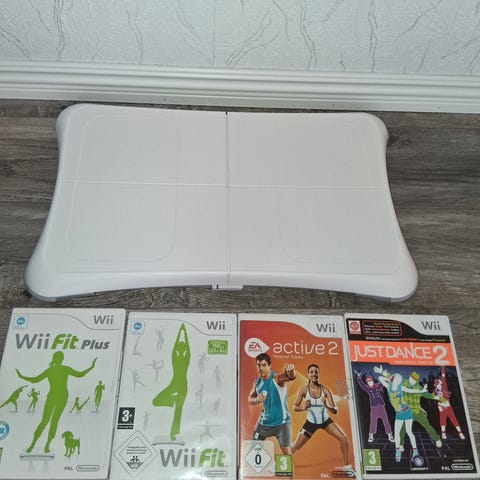 Flera spel enligt bilderna, bland annat tränings- och sportspel anpassade för Wii och Balance Board.