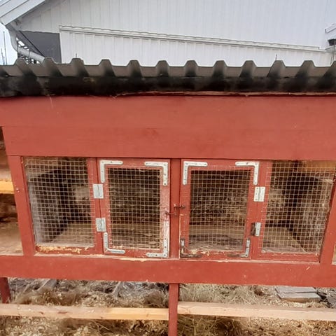 Kaninbur utebur i trä med två dörrar framtill och nätsektioner för ventilation. Huset står på ben och har ett tak med skyddande ytskikt. Passar för kaniner eller andra mindre gnagare vid utomhusbruk, i kombination med hage eller inhägnad. Mindre separat trälåda med lock syns också på bilderna, som kan användas som extra skydd eller förvaring i anslutning till buren.