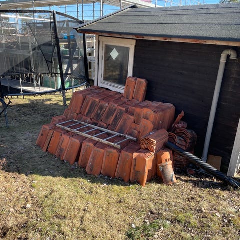 Hemmabygge på veteransläp. Trävagn med tak i röd träkonstruktion. Vagnen har öppna sidor med ribbor och ett plåttak som skydd mot väder. Den är monterad på chassi med dragstång framtill för att kunna kopplas till fordon. Lämplig som förvaringsvagn eller enklare transport av material på gård eller liknande. Kanske skulle gå att åter få ut på vägar, men bäst att inte sikta på det. Det är vad det är- kanske ett hönshus, lekstuga eller som vi- använd den till flyttbart vedskjul.
