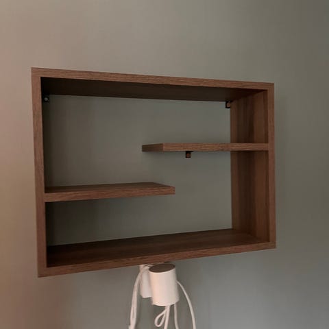 Svart hylla i metall med inbyggd lampa samt USB från Markslöjd.