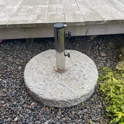 Parasoll med rund betongfot för uteplats eller altan. Parasollet har mörk duk och monteras i en stabil fot av betong som ger tyngd och stadga. Snabb äffer på grund av flytt.