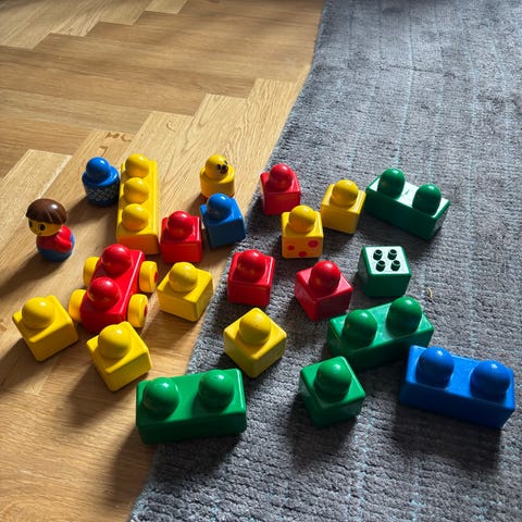 Lego Duplo klossar i en blandad uppsättning med olika former, färger och delar.