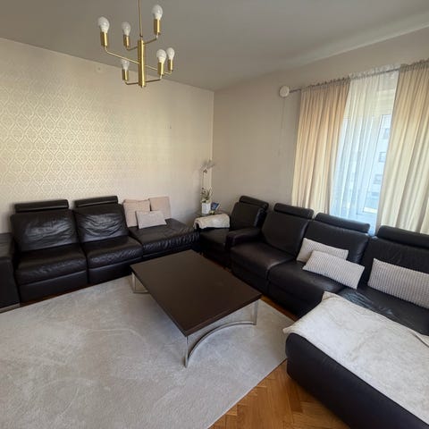 Soffgrupp med en 3-sitssoffa, en 2-sitssoffa och två fåtöljer i mörkbrunt läder. Sofforna och fåtöljerna har stoppade armstöd och sitsar samt träben. Passar för vardagsrum eller större sällskapsytor där flera sittplatser önskas i samma stil och färg. Inköpt 2018 för 36.000 kr..