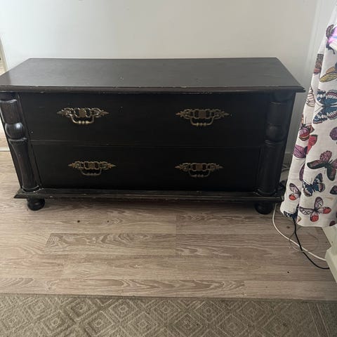 Bänk i använt skick. Det finns en del repor och en liten buckla i hörnet på övre plan.
