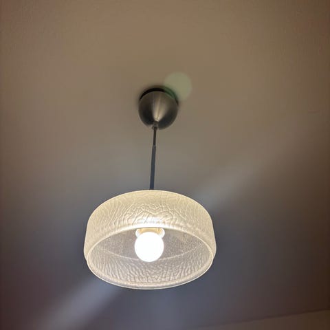 Funkis kub-pendellampa i metall och opalglas. Retro, vintage, bauhaus-stil taklampa.