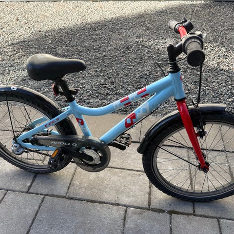 Barncykel med 20" hjul i blå färg. Märke BBF (tysk), modell Mover. Utrustad med pakethållare bak, kedjeskydd, LED lampor och fotstöd. Passar för barn som behöver en cykel i denna hjulstorlek för vardagscykling och fritidsbruk.