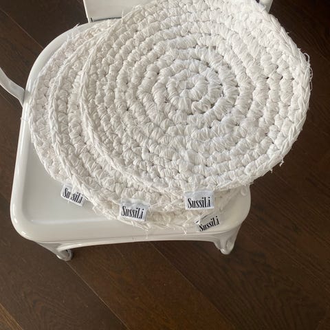 Grytlappar i virkad ljusblå bomull. Kvadratiska med upphängningsöglor i hörnet. Passar för användning i kök som skydd vid hantering av varma kastruller och formar. Säljes som par.