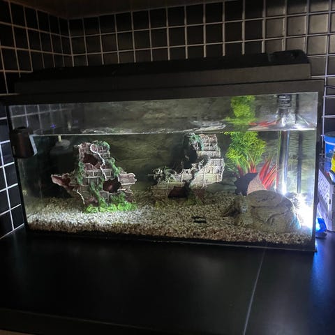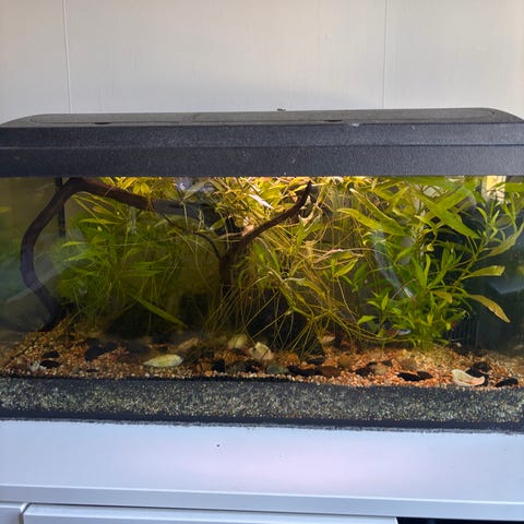 Akvarium i glas med inredning. Akvariet är rektangulärt och står på ett underlag av trä i bilderna. Inuti finns konstgjorda växter, stenar och grus på botten. Akvariet lämpar sig för sötvattensfiskar och kan användas som inomhusakvarium. Ytterligare teknisk information som volym, mått och belysning framgår inte av bilderna.