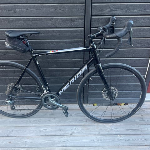 Scott landsvägscykel i svart/lila färg. Utrustad med bockstyre, smala däck och flera växlar anpassade för landsvägskörning. På styret sitter cykeldator och belysning monterade. Cykeln kan monteras på en träningsrulle, och ett särskilt träningsdäck för trainerbruk. Lämplig för landsvägsträning utomhus och för användning på trainer inomhus med passande däck. Cykeln har åkt Vätternrundan tidigare. Årsmodell osäker men från innan 2014