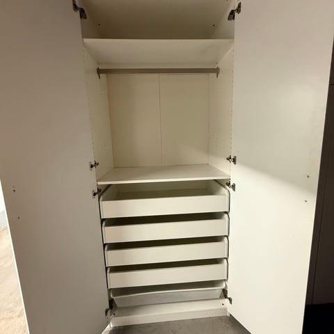 Helt funkar utmärkt lådorna och skjutdörrar och blå glaset stor Pax garderober med två sektioner i använt skick , flera trådbackar och hyllor. finns ingen större skador eller repor, men finns små skruvs hål på en sidan. Perfekt för stor Sovrummet eller Hall