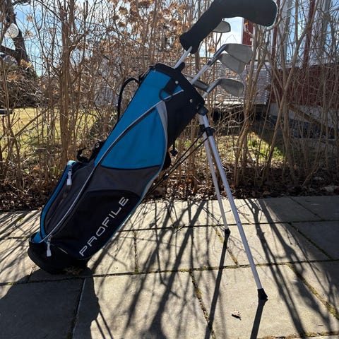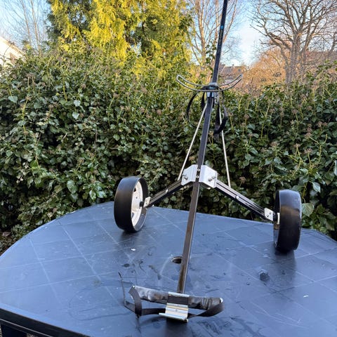 Four D golfbag med vagn i blå färg. Golfbagen är monterad på en tvåhjulig golfvagn med handtag. Flera klubbor och headcovers syns i bagen. Passar för förvaring och transport av golfklubbor på golfbanan.