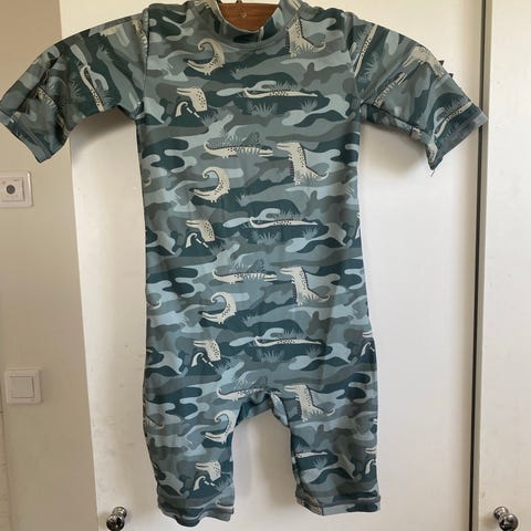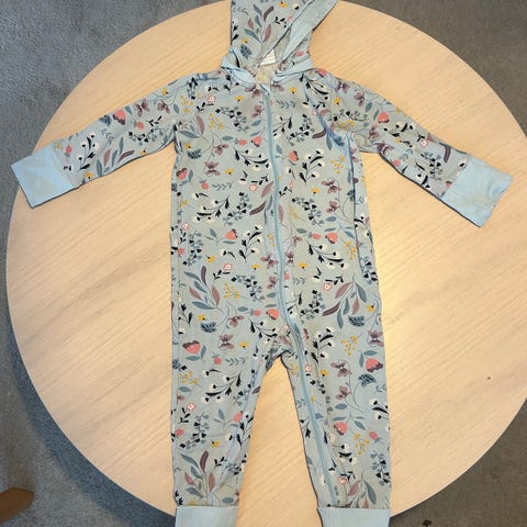 En mörkblå pyjamas med långa ärmar och ben. Pyjamasen har ett mönster av skogsdjur som ekorrar, rävar och ugglor, samt träd, månar och stjärnor. Texten "UNDER THE STARS" är också insprängd i mönstret. Pyjamasen knäpps med tryckknappar längs hela framsidan, från halsen ner till ena foten.
