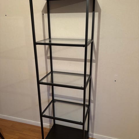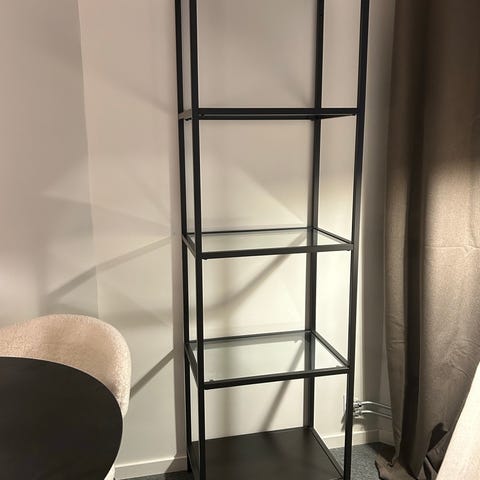 Hylla med glashyllor. Svart, glas. 175,5 h, 36 d, 51 b.
