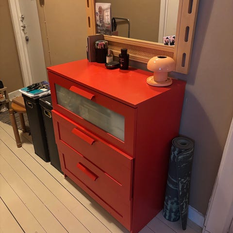 Skänker bort vår byrå pga nytt köp.Ena lådan går ej att trycka in utan man måste laga.Annars är den i bra skick.