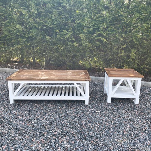 2 st Soffbord i massivt trä köpta på Mio, målade men går att slipa bort färgen. Liten glasskiva i mitten av bordet som går att ta bort om man vill.