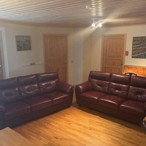 Fåtöljerna har måtten 100 cm bredd, 100 cm djup och 95 cm höjd. Soffa o fåtöljer har samma färg bara ljuset som skiljer.