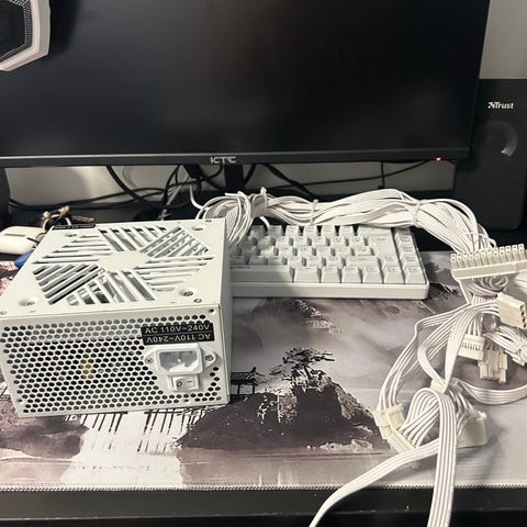 Corsair CV550 psu för stationär dator med effekt på 550W. Standard ATX-formfaktor med inbyggd fläkt och fast kabeldragning. Utrustat med nätströmsanslutning, strömbrytare och flera utgångskablar för anslutning till moderkort, lagringsenheter och andra komponenter. Passar som strömförsörjning i stationära datorbyggen som kräver upp till 550W.