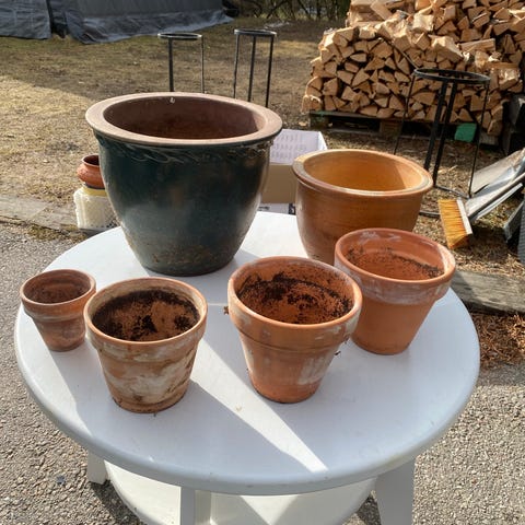 Två stora terrakottakrukor, höjd ca 31 cm, bredd ca 38 cm upptill. Hål i botten. Bra använt skick. Pris 150 kr styck, båda för 250 kr.