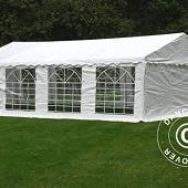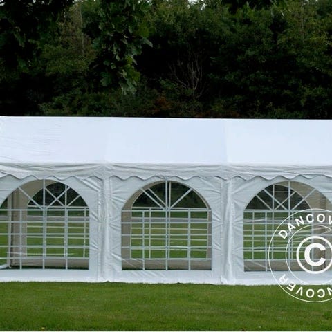 Komplett partytält från Bauhaus använt en gång. Tältet har fönster längs sidorna och två dörröppningar. Ram i kraftig galvaniserad metall med rördimension 38x1 mm. Tak i PVC 500 g/m² och väggar i PVC 380 g/m². Höjd cirka 2,8 m med bra takkonstruktion (som takstolar) som är lätt att smycka med tyll och blommor.