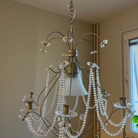 Fin ljuskrona i smide med 6 armar och tillhörande glas. Ger ett mysigt och stämningsfullt ljus.