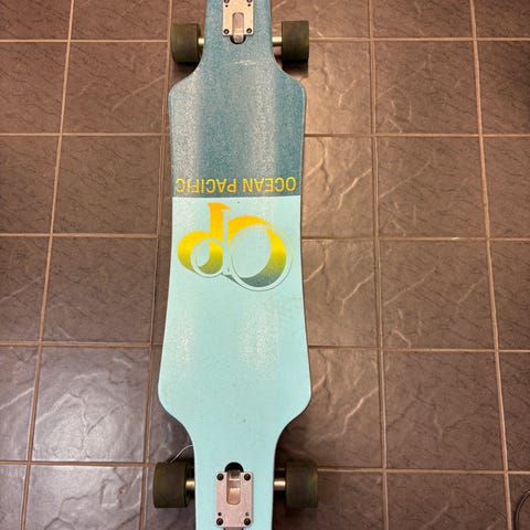 Firefly longboard med avlång bräda och spetsig nose/tail. Ovansidan har sandpapper för grepp och undersidan är röd med grafiskt motiv och Firefly-logotyp. Utrustad med truckar och hjul som passar för cruising och åkning på asfalt.