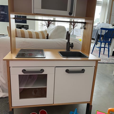 Säljer ett leksakskök ”DUKTIG” från IKEA. Köket är i fint skick. Vi har monterat självhäftande griffeltavla på baksidan av köket så att barnen kan skriva menyer etc. när det ska lekas kiosk.