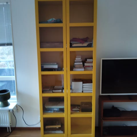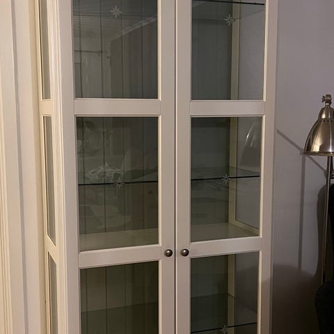 Vitrinskåp med fyra glasdörrar och flera hyllplan i grönmålat trä. Övre och nedre del har två dörrar vardera med runda knoppar. Skåpet ger god överblick över innehållet och lämpar sig för förvaring av porslin, glas, böcker eller prydnadssaker i vardagsrum, kök eller matsal. Hyllplan B71cm,D 32cm