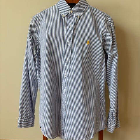 Ralph Lauren Polo Custom Fit herrskjorta i storlek M. Skjortan är ljust lila och tillverkad i bomull. Modellen har lång ärm, krage och knappslå framtill. Passformen är Custom Fit, vilket ger en något insydd silhuett. Lämplig för vardag eller mer uppklädda tillfällen.