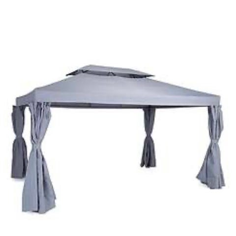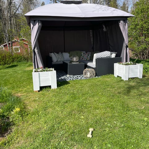 Paviljong från Clas Ohlsson med myggnät i beige färg. Tältet har tak och sidoväggar som kan öppnas och stängas med dragkedjor samt fästas med band. Konstruktionen har upphängningsskena med krokar för gardinerna. Svart metallstomme. Endast använt en säsong så i fint skick!