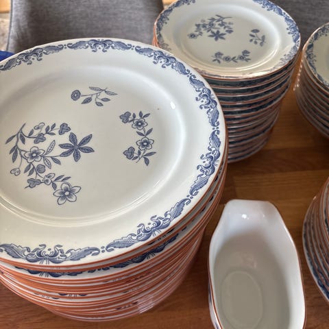 Tallrikar 11 st diamanter 26 cm, 6 st skålar från Ikea, ovala fat 4 st och ett större fat.