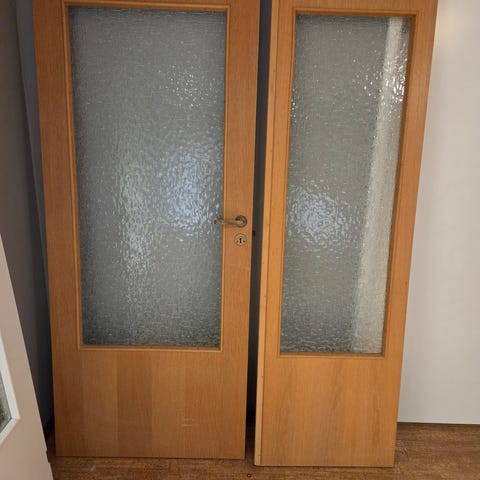 Två innedörrar original från 1922. Färgen har flagat annars fint skick. Inte använts på länge och stått torrt men ej blivit underhållna
