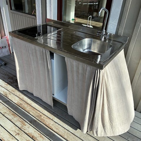 Diskbänk, kyl och spis.
