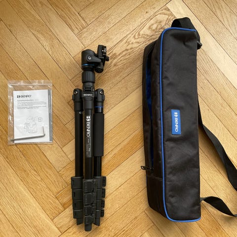 Benro kameraväska i svart och blått tyg. Väskan har vadderad insida för skydd av kamera och tillbehör. Utrustad med axelrem med vadderad axelkudde samt ytterfack med dragkedja för mindre tillbehör som batterier, minneskort eller kablar. Passar för förvaring och transport av kamera och fotoutrustning.