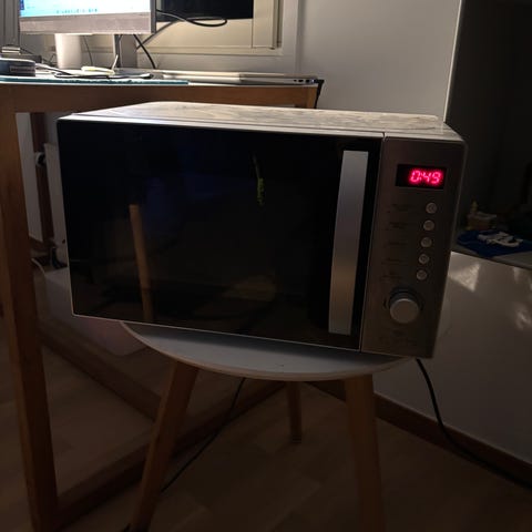 Samsung mikrovågsugn i vit färg. Fristående modell med front i svart glas och panel med knappar på sidan.