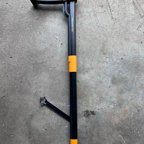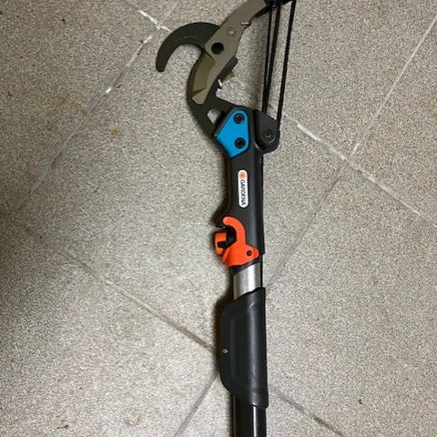 Fiskars grensax med teleskopskaft. Långt skaft för att nå högre grenar utan stege. Klippdel med skyddslock som kan tas av vid användning. Passar för beskärning av träd och buskar i trädgård.