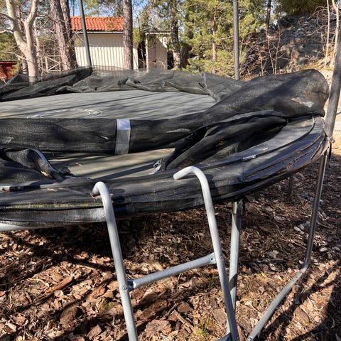 I befintligt skick bortskänks. Själva mattan är i fint skick. Stabil. Nät och stolpar behöver bytas. Från Jumpking trampolines. 250/350cm.