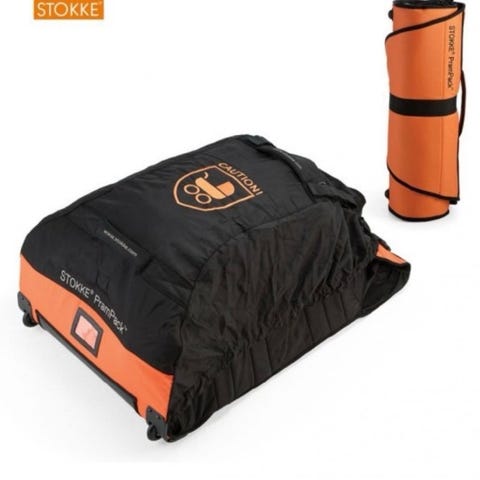 Stokke PramPack resefodral för barnvagn i orange färg med svarta detaljer. Fodralet är utformat för att skydda barnvagn under resa och transport. Det har dragkedja, bärhandtag och remmar för att hålla innehållet på plats. Passar de flesta standardbarnvagnar enligt tillverkarens anvisningar. Lämpligt vid flygresa, tågresa eller annan transport där barnvagnen behöver extra skydd.