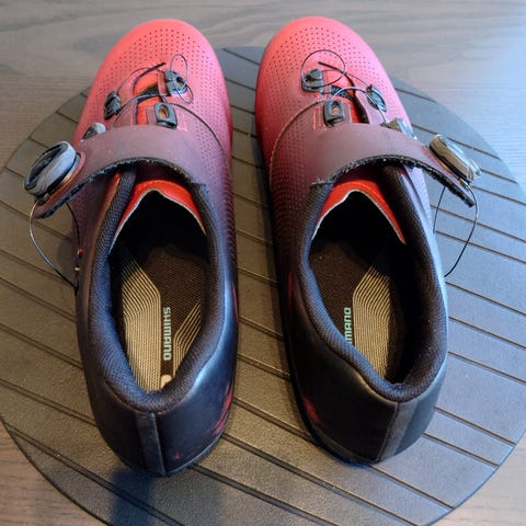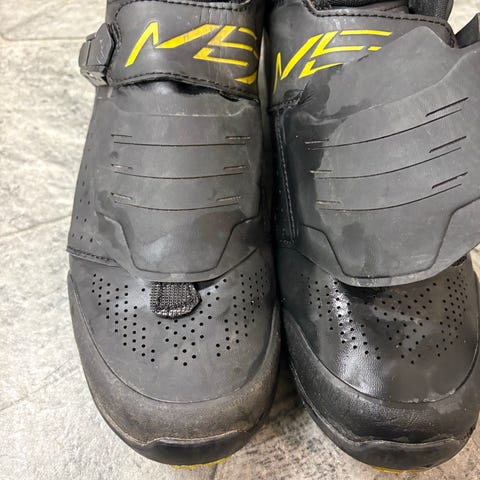 Shimano cykelskor SPD i storlek 43. Skorna är svarta med snörning och kardborreband över vristen för extra stabilitet. Sulan är mönstrad med infällda SPD-klossar för användning med kompatibla pedaler. Överdelen är i syntetmaterial med perforeringar över tån för viss ventilation. Passar för MTB cykling.
