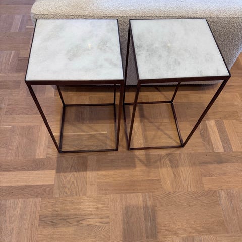 Säljer två stilrena sidobord/nattduksbord i vit metall och vit marmor skiva. Jättegott skick och inga synliga skador eller fläckar.
