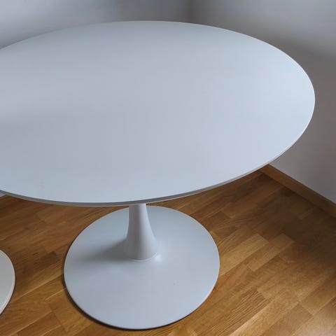 Köksbord med 2 st utdragbara skivor à 27 cm vardera. Utdragsskivorna kan fällas in under bordsskivan då de inte används. Det finns en spricka i lacken mitt på bordet (se bild) i övrigt är det i gott skick.