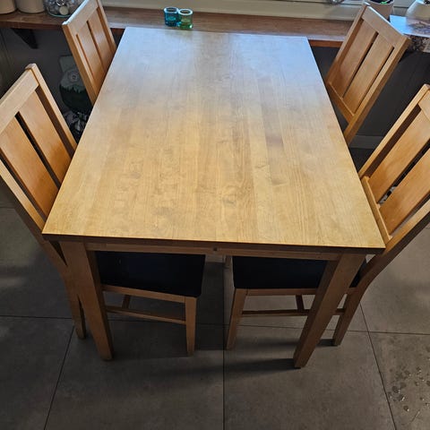 Matbord i gott skick med 4 stolar säljes. Bordet är stabilt och praktiskt, perfekt för både vardag och gäster. Det har en smart sidoförlängning (klaff) som enkelt kan fällas upp för att ge extra utrymme vid behov.