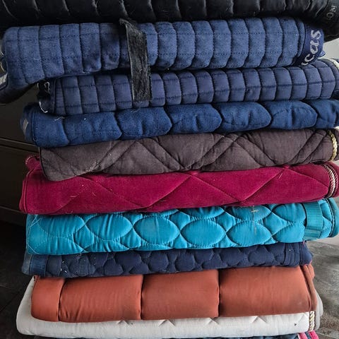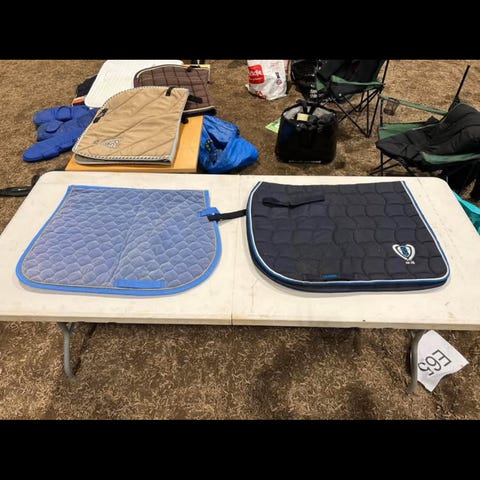 Sadelpadar för häst, en i perforerad gel och en i fårskinn med brun ovansida. Gelpaden är utformad för att ligga mellan sadel och häst och har hålmönster för ventilation och tryckfördelning. Fårskinnspaden har quiltad ovansida och mjuk undersida i fårskinn för extra dämpning och komfort under sadeln. Passar de flesta standardsadlar och används som stötdämpande och tryckutjämnande underlag vid ridning.