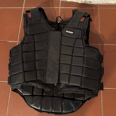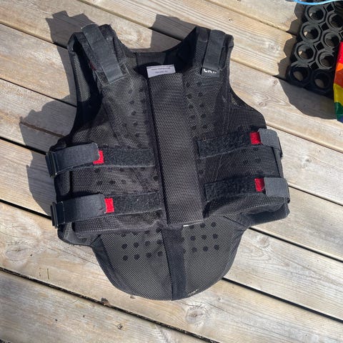 Airowear Junior Outlyne säkerhetsväst i storlek Y2 Regular. Västen är svart med blå detaljer och är avsedd för juniorer. Bröstmått enligt etikett: 54–60 cm. Modellen uppfyller standarden BS EN 13158:2018 Level 3. Justerbara remmar i sidorna och axlarna ger möjlighet till anpassad passform. Västen är avsedd som rygg- och kroppsskydd vid ridning och annan hästsport.