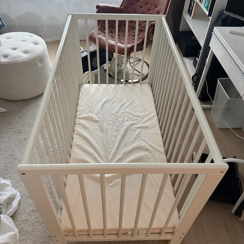 IKEA utdragbar barnsäng i vit metall. Sängen är justerbar i längd och kan anpassas efter barnets längd. Den har höga gavlar och sidoskydd som hjälper till att hålla barnet på plats under natten. Passar som övergångssäng mellan spjälsäng och fullstor säng. Madrass ingår normalt inte utan väljs efter den utdragbara funktionen och önskad längd.